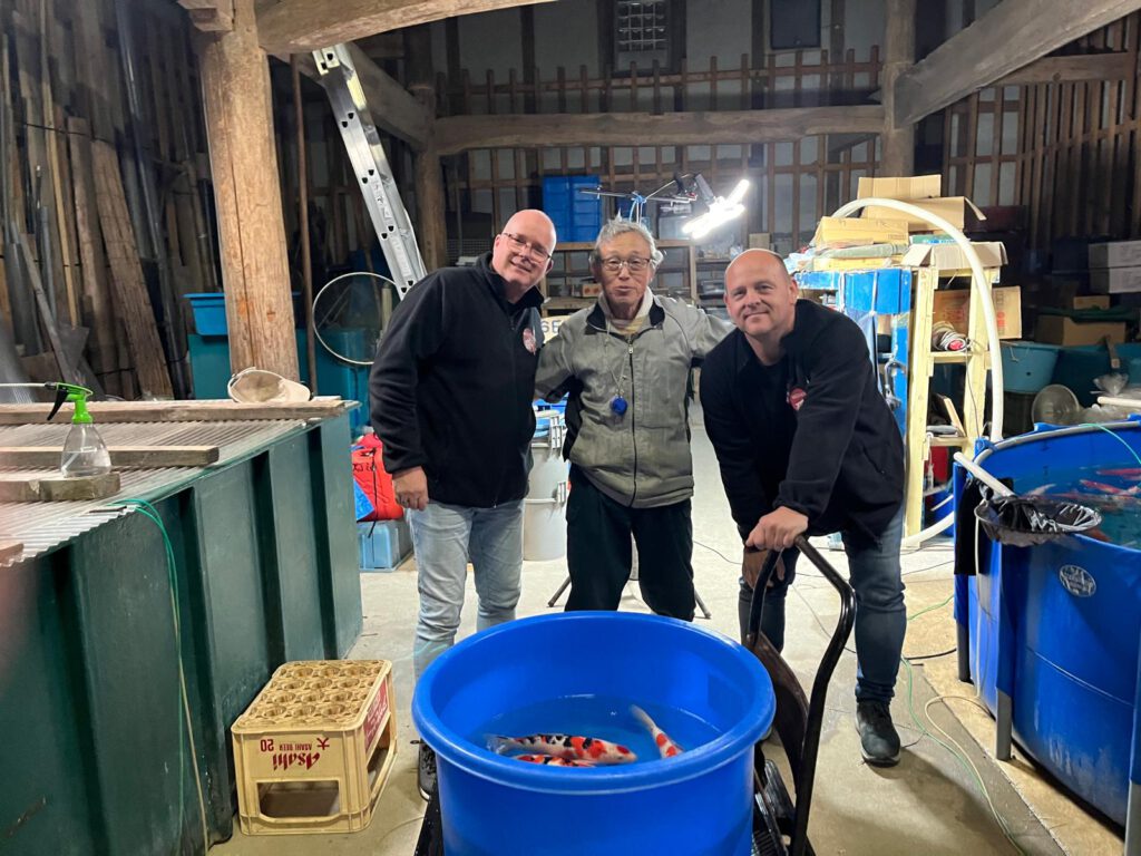 Inmiddels tikte de klok 17:30 en was het al donker. Toch kwam er nog een telefoontje van de kweker Abe. We waren hier eerder deze week en zagen in een bassin mooie Nisai en Sansai koi zwemmen. Deze koi bleek Tategoi te zijn en niet te koop (dus zijn beste vissen, eventueel in te zetten als ouderpaar in de toekomst). Eenmaal daar aangekomen had hij besloten toch een paar vissen te willen verkopen en wij mochten in het donker (met een bouwlamp) een 6-tal koi selecteren. Het beeldmateriaal is niet zo goed, maar eenmaal in Enschede straks leggen we deze mooi koi wat beter vast op beeldmateriaal.
