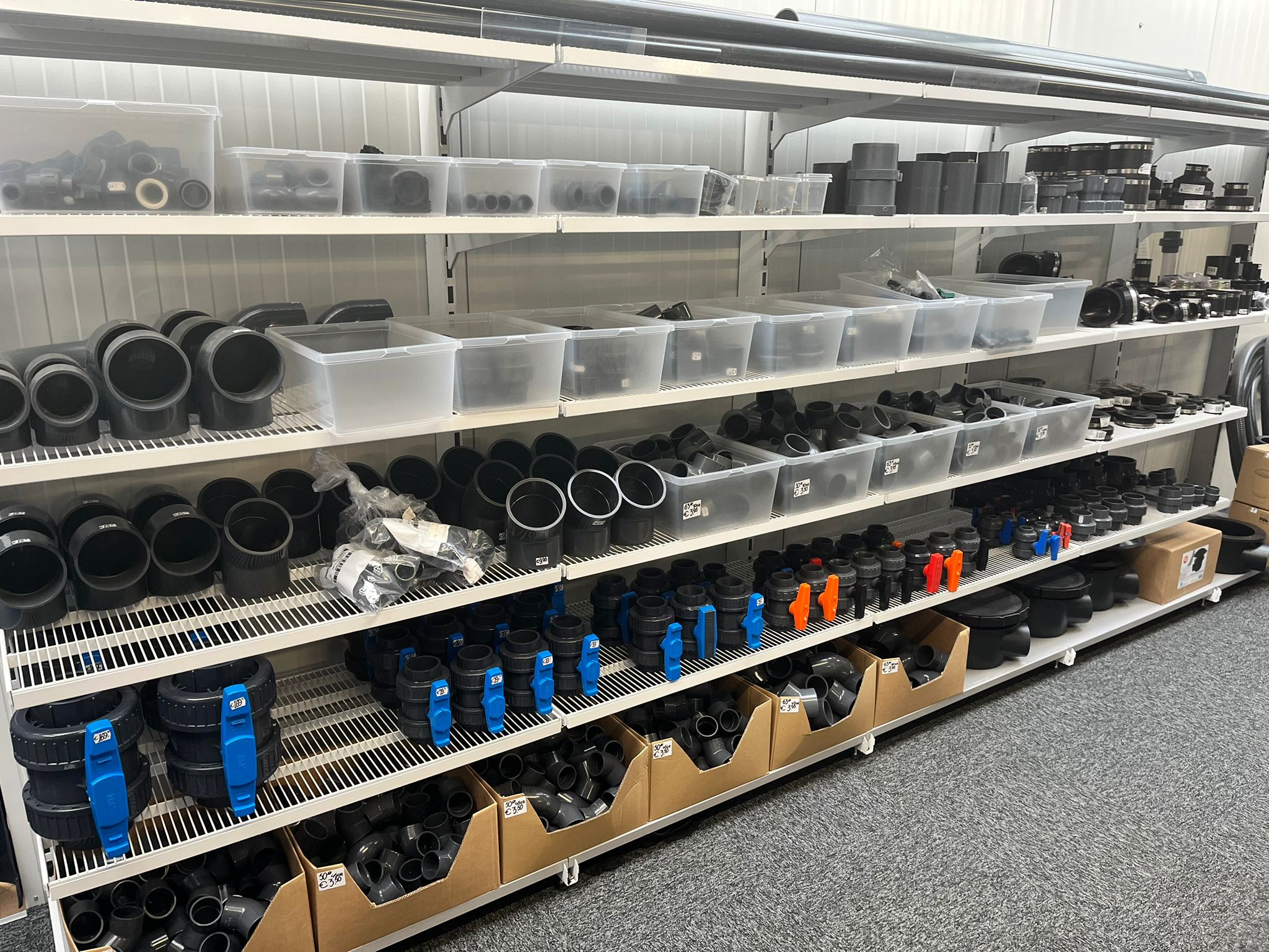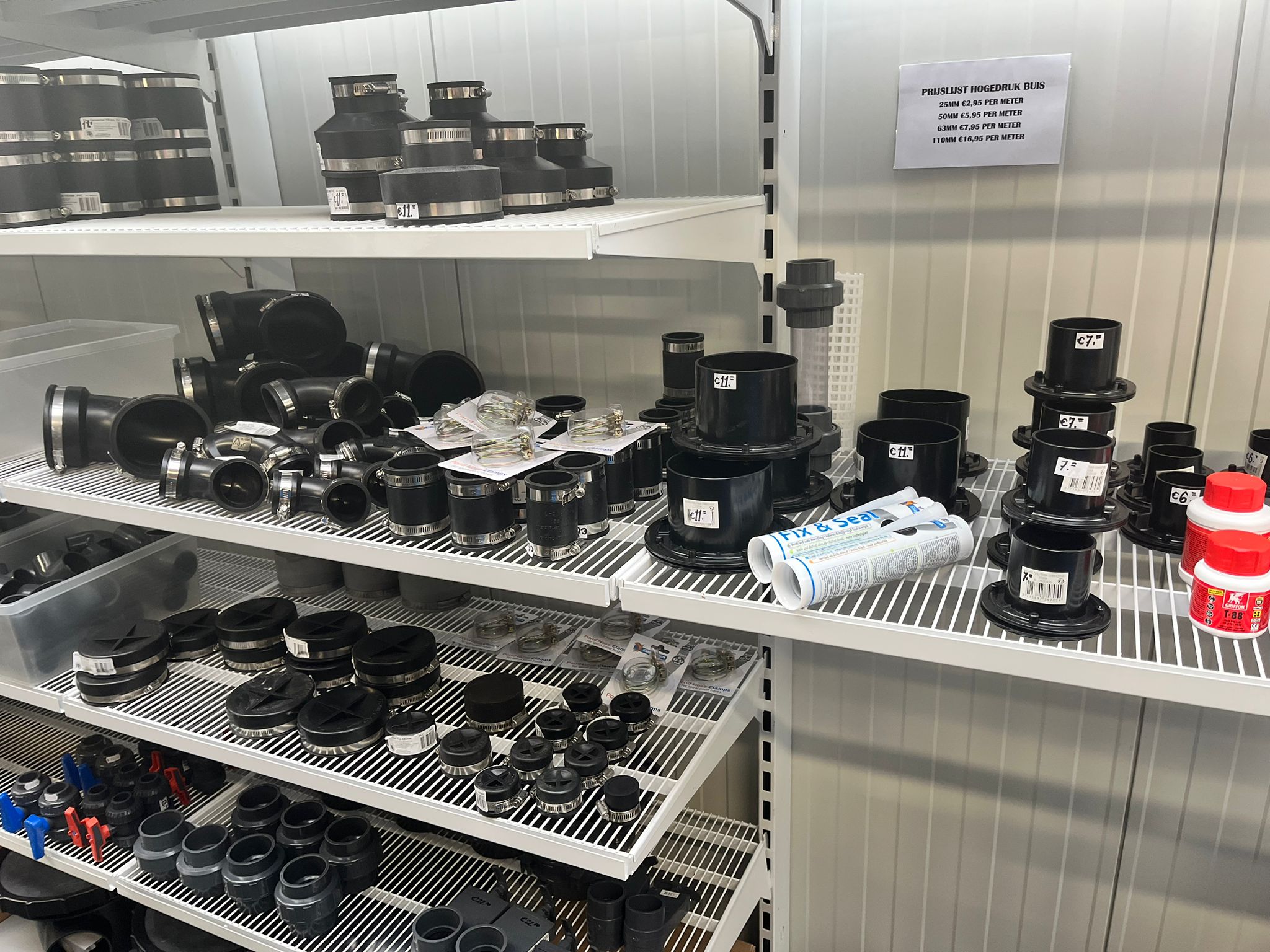 Naast skimmers, bodemdrains, doorvoeren, rubberen verlopen of bochten hebben we een heel groot assortiment PVC in onze winkel. Een korte opsomming (kom voor het complete assortiment in de winkel om het allemaal te bekijken!)