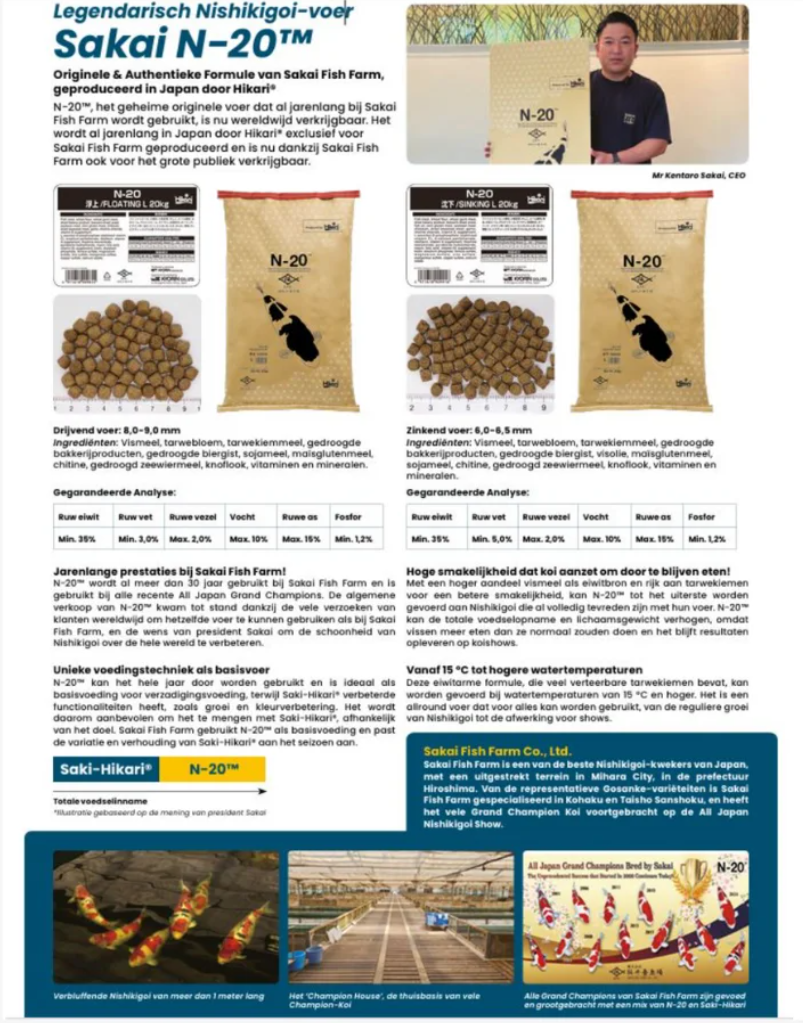 Sakai N-20 Sinking L 20 KG. (6.0 mm – 6.5 mm) U kunt Sakai N-20 voeren vanaf een watertemperatuur vanaf 15 °C Het originele geheime voer dat al jarenlang bij Sakai Fish Farm wordt gebruikt, is nu wereldwijd verkrijgbaar.